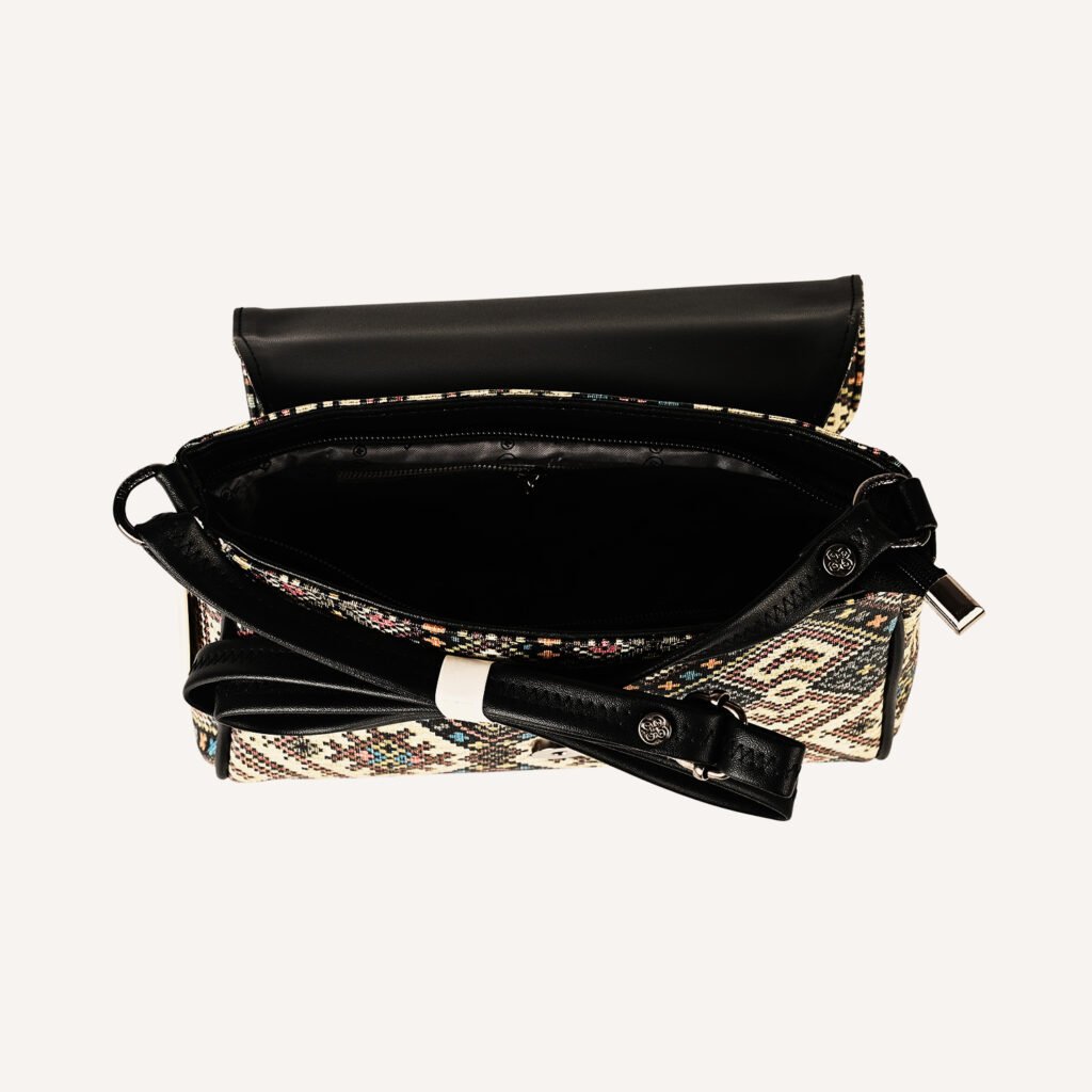 Bring a touch of tradition to your modern wardrobe with this stunning ethnic-pattern sling bag from Bexlee. Featuring a rich black-and-beige color combination with vibrant geometric motifs, this bag is a perfect blend of culture and contemporary fashion.
