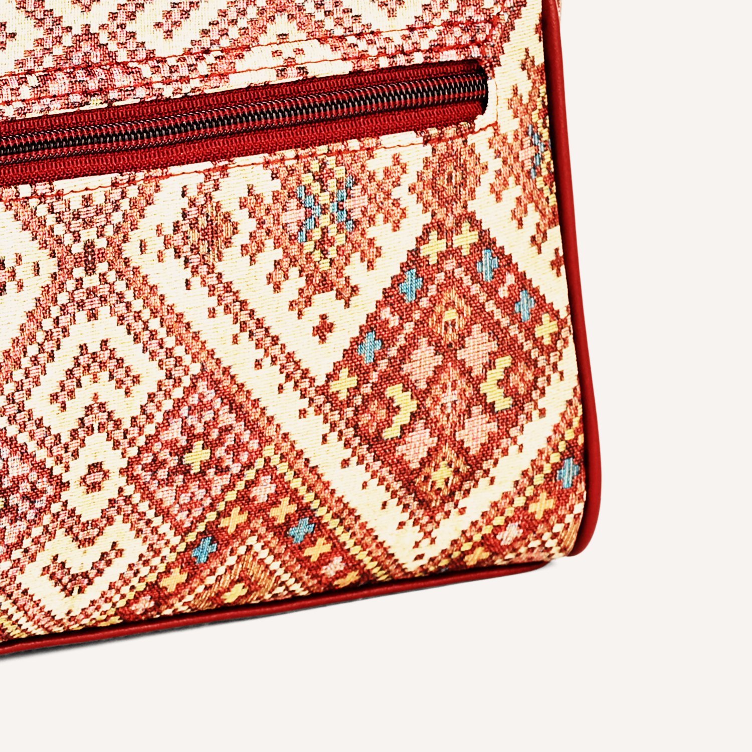 - Make every outfit stand out with this ethnic print vegan leather sling bag – where culture meets contemporary style.